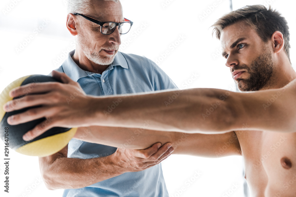 Selective Focus Of Doctor In Glasses Looking At Shirtless Patient Working Out With Ball Stock Photo Adobe Stock